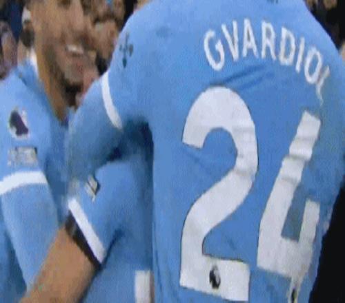 进球之后,福登滑跪庆祝,瓜迪奥拉与助教们拥抱在一起,而哈兰德冲入球门爆射皮球。